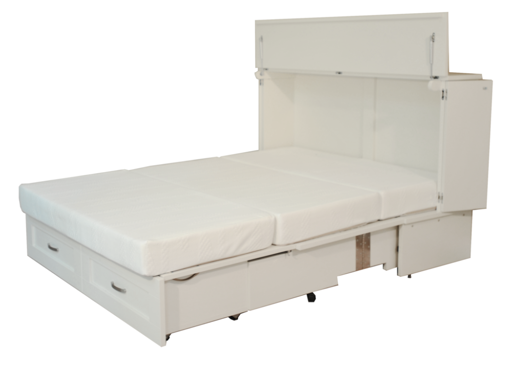 The Country Style is styled traditionally and can accommodate many decors. It consists of a free standing Cabinet featuring shaker style panels that easily converts into a comfortable bed in under 30 seconds. The side panels open during use and the unit can support a 60" TV screen. Available in double and queen.